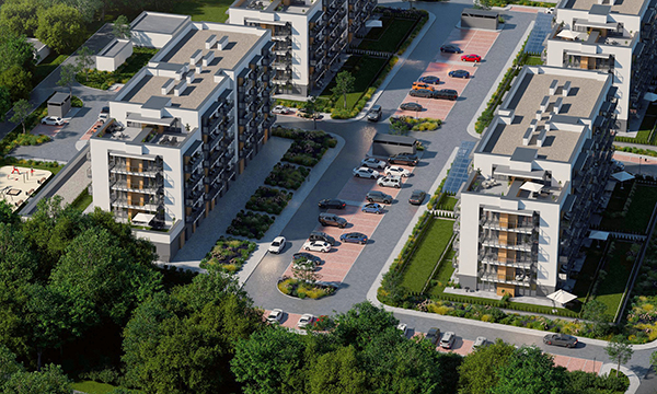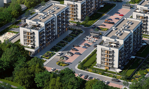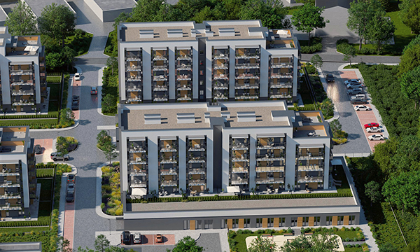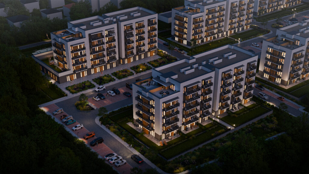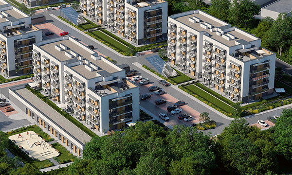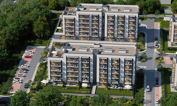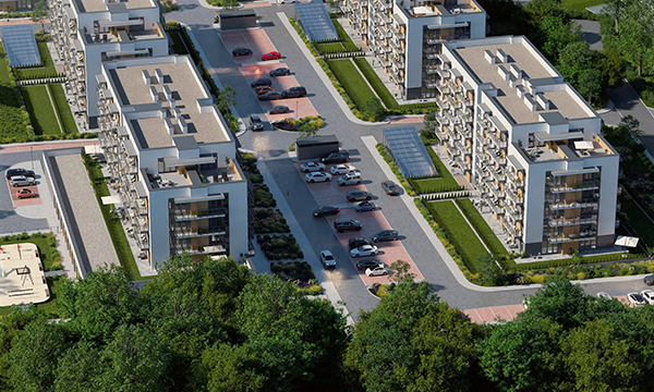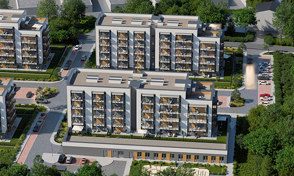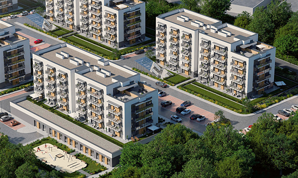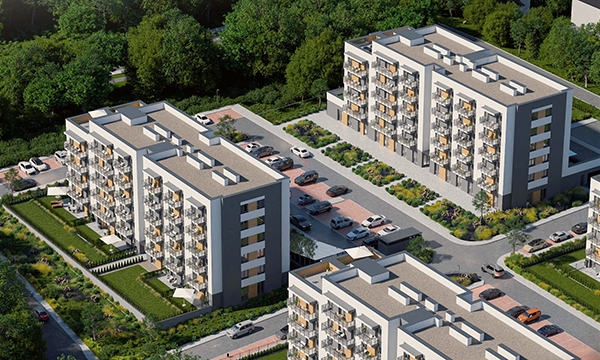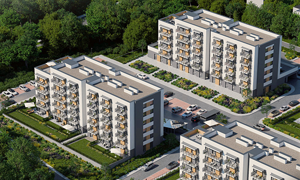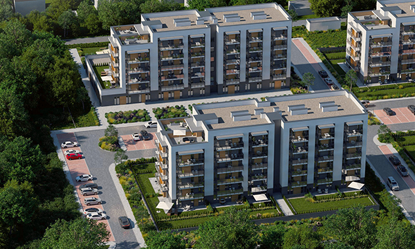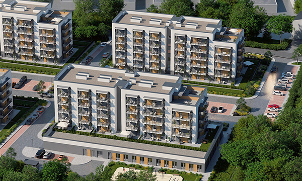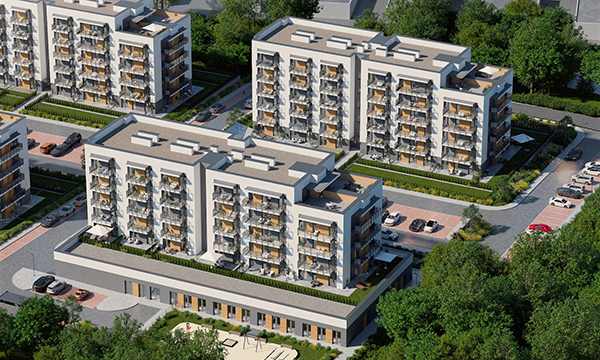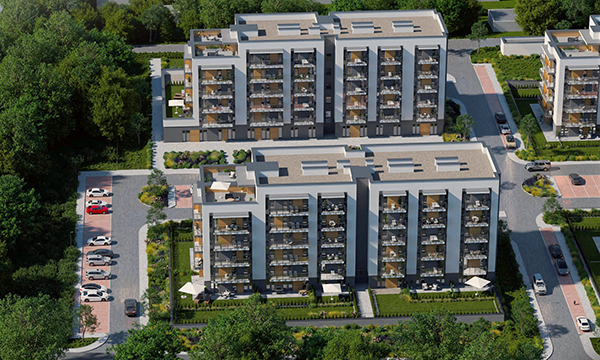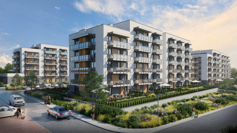 Osiedle Zielona Chorzowska w Rudzie Śląskiej jest nowoczesną inwestycją, zaprojektowaną z myślą o komforcie i estetyce. Pierwszy etap to dwa eleganckie bloki mieszkalne, wyróżniające się elewacją z elementami imitującymi drewno, które harmonijnie wpisują się w otaczającą zieleń. Starannie zagospodarowany teren obejmuje liczne nasadzenia, place zabaw, szerokie wygodne ulice oraz przestrzenie sprzyjające relaksowi mieszkańców.