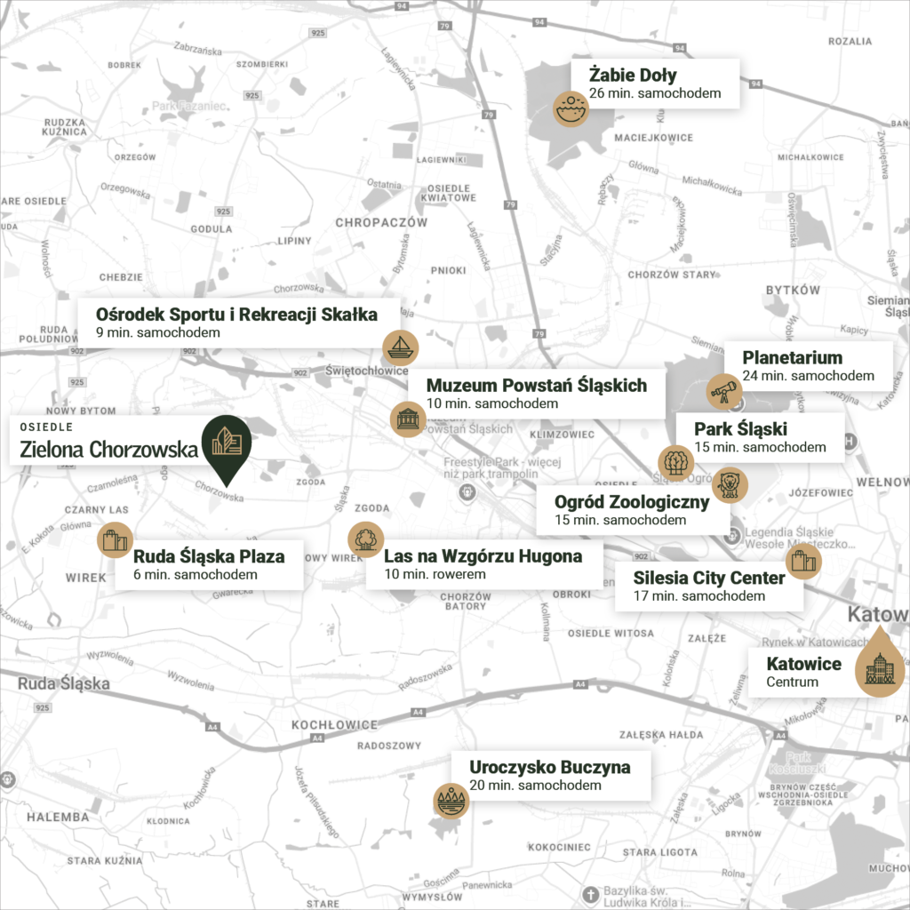 Osiedle Zielona Chorzowska znajduje się przy ul. Chorzowskiej w Rudzie Śląskiej. Okolica jest pełna terenów zielonych, umożliwiających odpoczynek na łonie natury. To lokalizacja w sercu Śląska. W zaledwie 15 minut dotrzesz samochodem do takich miejsc jak: Park Śląski, Stadion Śląski czy Silesia City Center, które oferują szerokie możliwości spędzania wolnego czasu. Dzięki dogodnemu położeniu masz szybki dostęp do głównych arterii komunikacyjnych oraz przystanków autobusowych, co sprawia, że życie tutaj jest po prostu wygodne.